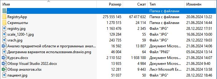 - прочие файлы: картинки для приложения, книга Excel с обзором аналогов, текстовые файлы с обзором на Visual Studio 2022, анализ предметной области, диаграмма вар. исп (прецедентов).