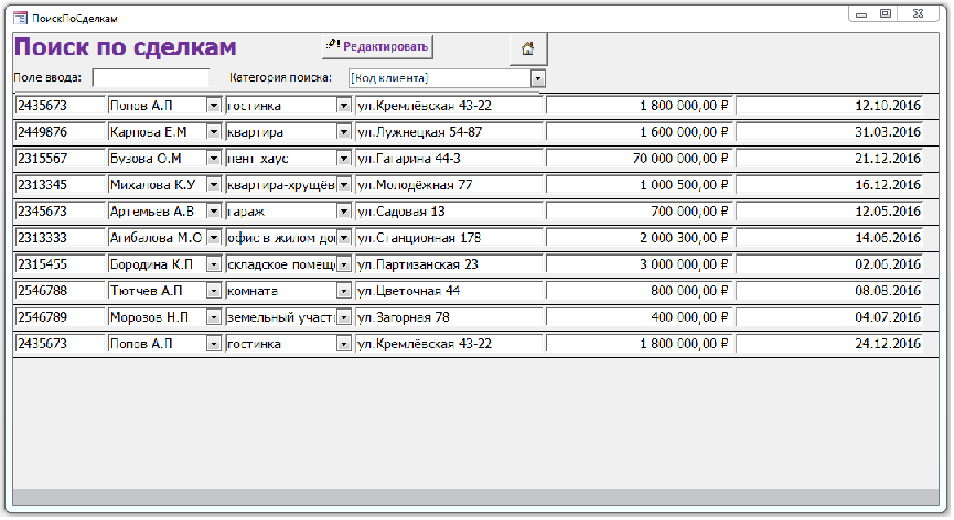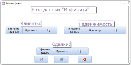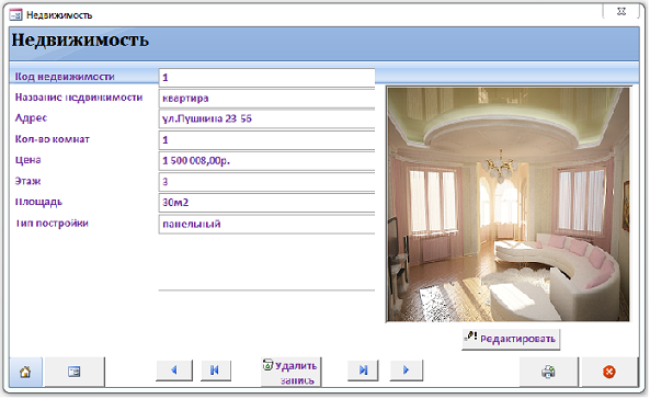 В данной БД, записи и данные можно: изменять, удалять, добавлять новые записи, есть поиск по разным критериям: в клиентах, недвижимости и сделках, всегда есть выход на главную форму, есть справка, где при открытии её появляются окна, где можно узнать как работать с БД, как осущевствляется в ней поиск и тд. Есть кнопка печати, любых данных из БД.