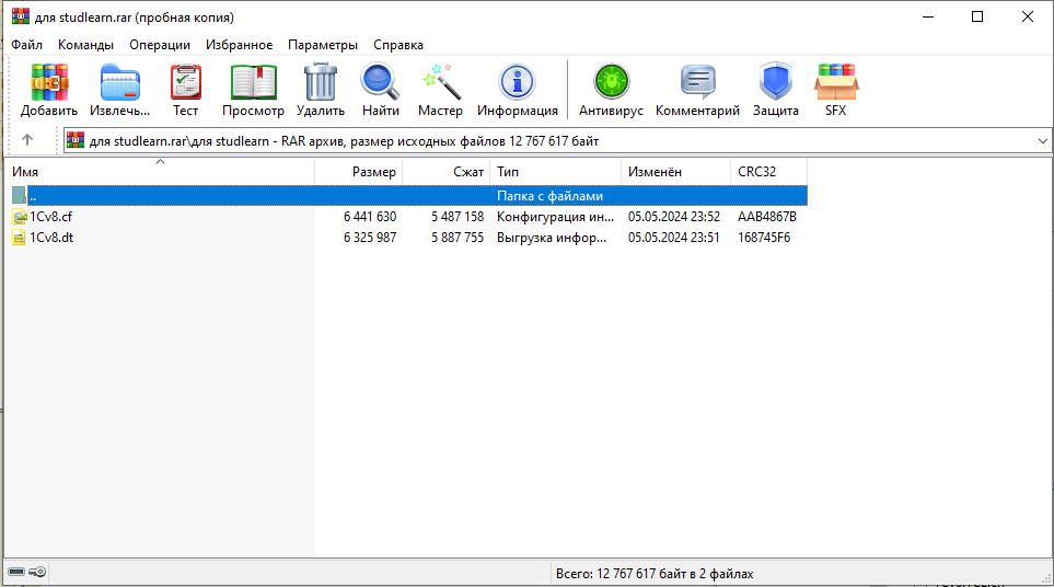 1Cv8.dt - файл информационной базы(имеет тестовые данные в предприятии 1С), чтобы загрузить нужно открыть конфигурацию. В верхнем меню выбрать Администрирование/Загрузить информационную базу