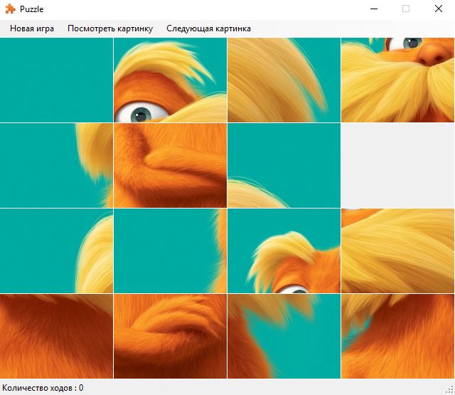 Любимая игра в пятнашки, разработнная в более интересном стиле для игры. Вместо привычных костяшек с номерами цифр до 15, было придумано решение разделить единую картинку на 15 частей. Таким образом нам требуется собрать картинку по тем же правилам, что и в пятнашках.