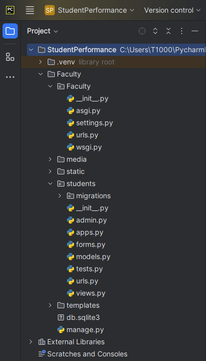 - После установки всего выше описанного, настройте VS Code для работы с Python установив необходимые расширения (см. инструкцию - https://youtu.be/j5e5gwZgMH8) . Если используете PyCharm то необходимо зайти в настройки, выбрать данный проект StudentPerfomance и выбрать интерпретатор. Установить все библиотеки отмеченные красным подчеркиванием. Перейдите в проект выполнив дейтвие - cd Faculty и введите команду python manage.py runserver.