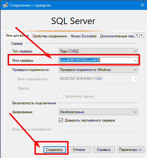 - Запускаем SQL Server, вводим название сервера, выполняем подключение.