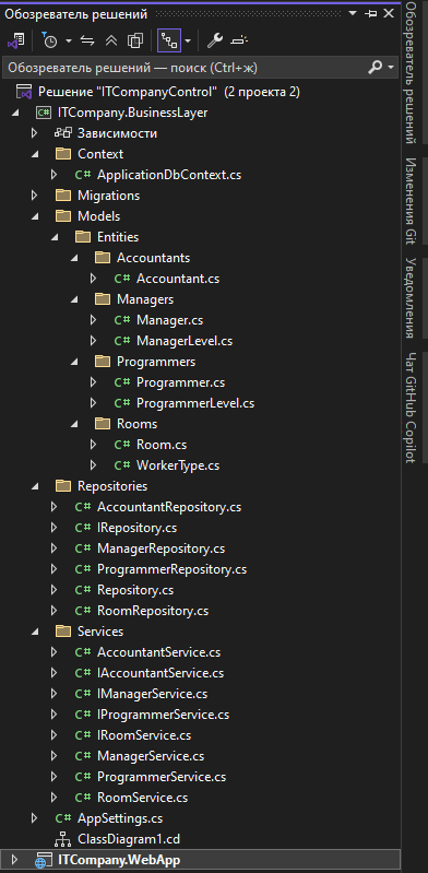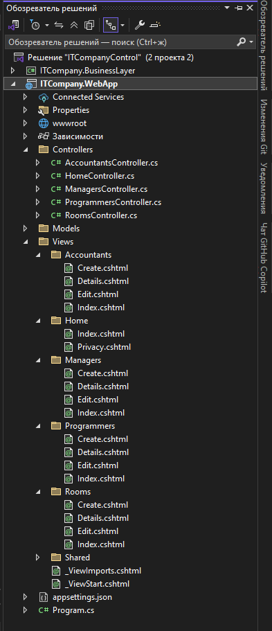 С помощью среды Visual Studio Community 2022 и платформы ASP.NET Core разработать приложение для контроля работы IT компании, удовлетворяющее следующимтребованиям: 1. Программа содержит страницы с информацией о программистах, менеджерах,бухгалтерах и комнатах, в которых работают сотрудники. 2. Начальное количество мест в каждой комнате равняется 10.3. Для программистов, менеджеров и бухгалтеров должны быть предусмотреныоперации добавления (приема на работу), редактирования (изменения данных осотрудниках) и удаления (увольнения). 4. Программисты, менеджеры, бухгалтеры размещаются в конкретных комнатах. 5. После добавления сотрудника количество мест в комнате, в которой размещаетсясотрудник, уменьшается количество мест.