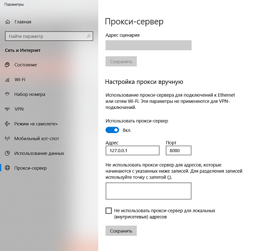 Для проверки работоспособности программы необходимо зайти в параметры прокси-сервера сети (используйте обычный поиск в Windows), выбрать прокси-сервер, включить его, в поле адрес вписать "127.0.0.1", в поле порт вписать "8080", нажать сохранить. Затем запустить программу и в браузере загрузить любую страницу по http (например baidu.ru, Example.com).