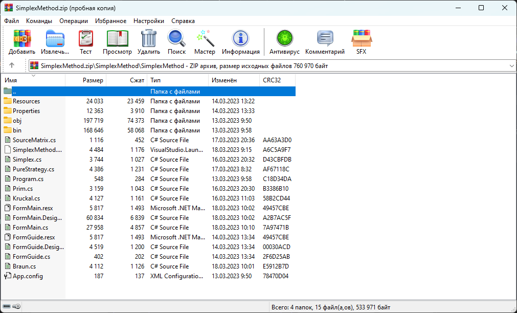 Код с алгоритмами находятся в отдельных классах, которые можно увидеть с обозревателе решений.