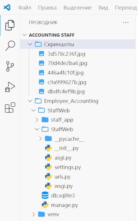 В терминале редактора кода выполнить переход на уровень выше командой - cd StaffWeb, где StaffWeb - имя проекта. Там же в терминале ввести команду python manage.py runserver. Запуститься сервер приложения, в терминале будет отображаться ссылка, нужно перейти по данной ссылке и посмотреть на результат.